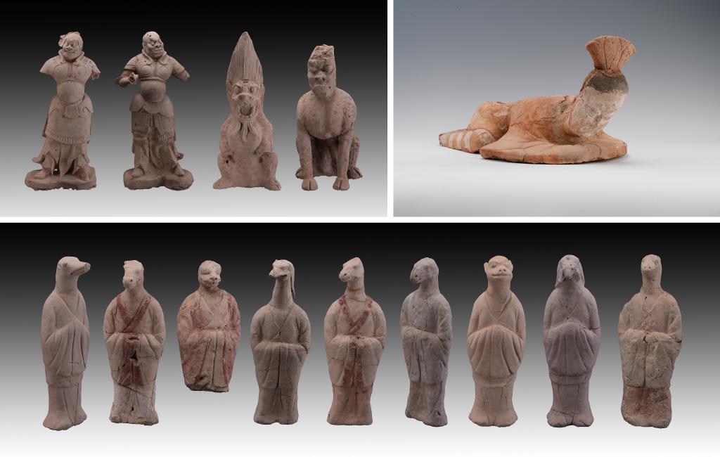 拼版照片:新疆吐魯番市巴達木東晉唐時期墓群出土的陶俑(資料照片)。新華社 發(fā)