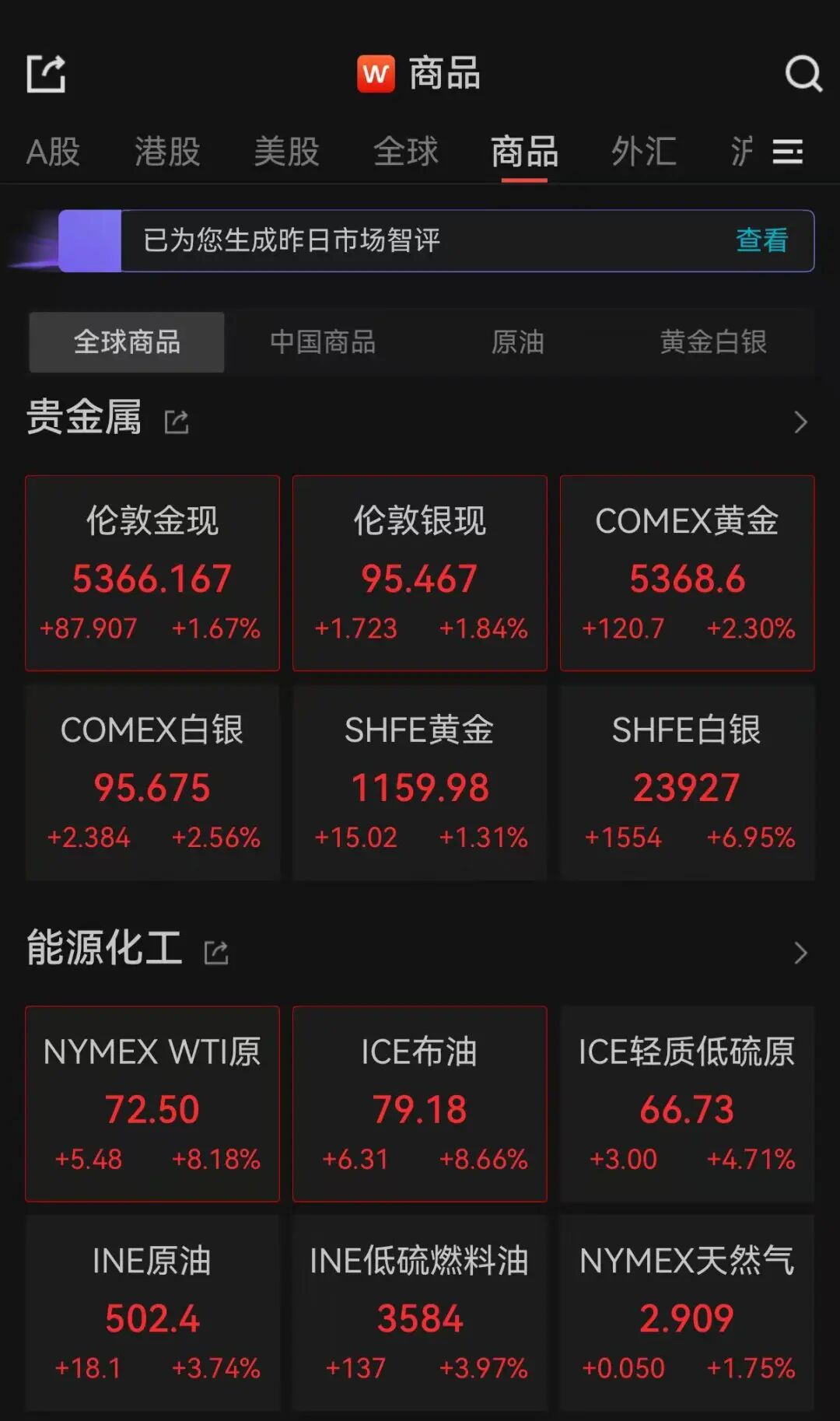 截至發(fā)稿,現(xiàn)貨黃金漲1.67%,盤中最高觸及5393美元/盎司,布油漲8.66%,美油漲8.18%。