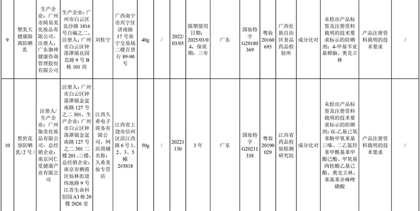 記者注意到,其中,產(chǎn)品標(biāo)簽標(biāo)示為歐萊雅(中國)有限公司生產(chǎn)的蘭蔻輕透水漾防曬乳(標(biāo)示批號:78W200)“未檢出產(chǎn)品標(biāo)簽及注冊資料載明的技術(shù)要求標(biāo)示的防曬劑”;產(chǎn)品標(biāo)簽標(biāo)示為朋友(上海)化妝品銷售有限公司進(jìn)口的普柔瑪絲特染發(fā)膏(配合普蓉斯綈雙氧乳)(標(biāo)示批號:7X15)“檢出產(chǎn)品標(biāo)簽及注冊資料載明的技術(shù)要求未標(biāo)示的染發(fā)劑”;產(chǎn)品標(biāo)簽標(biāo)示為資生堂(中國)投資有限公司經(jīng)銷的安熱沙金燦倍護(hù)防曬啫喱(標(biāo)示批號:1356TD)“產(chǎn)品標(biāo)簽與注冊資料載明的技術(shù)要求不一致”、“未檢出產(chǎn)品標(biāo)簽標(biāo)示的防曬劑”、“未檢出注冊資料載明的技術(shù)要求標(biāo)示的防曬劑”。
