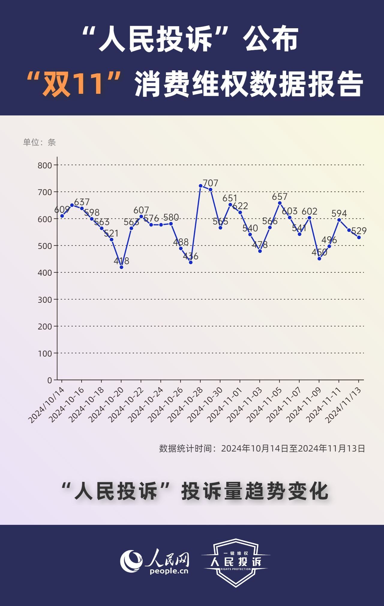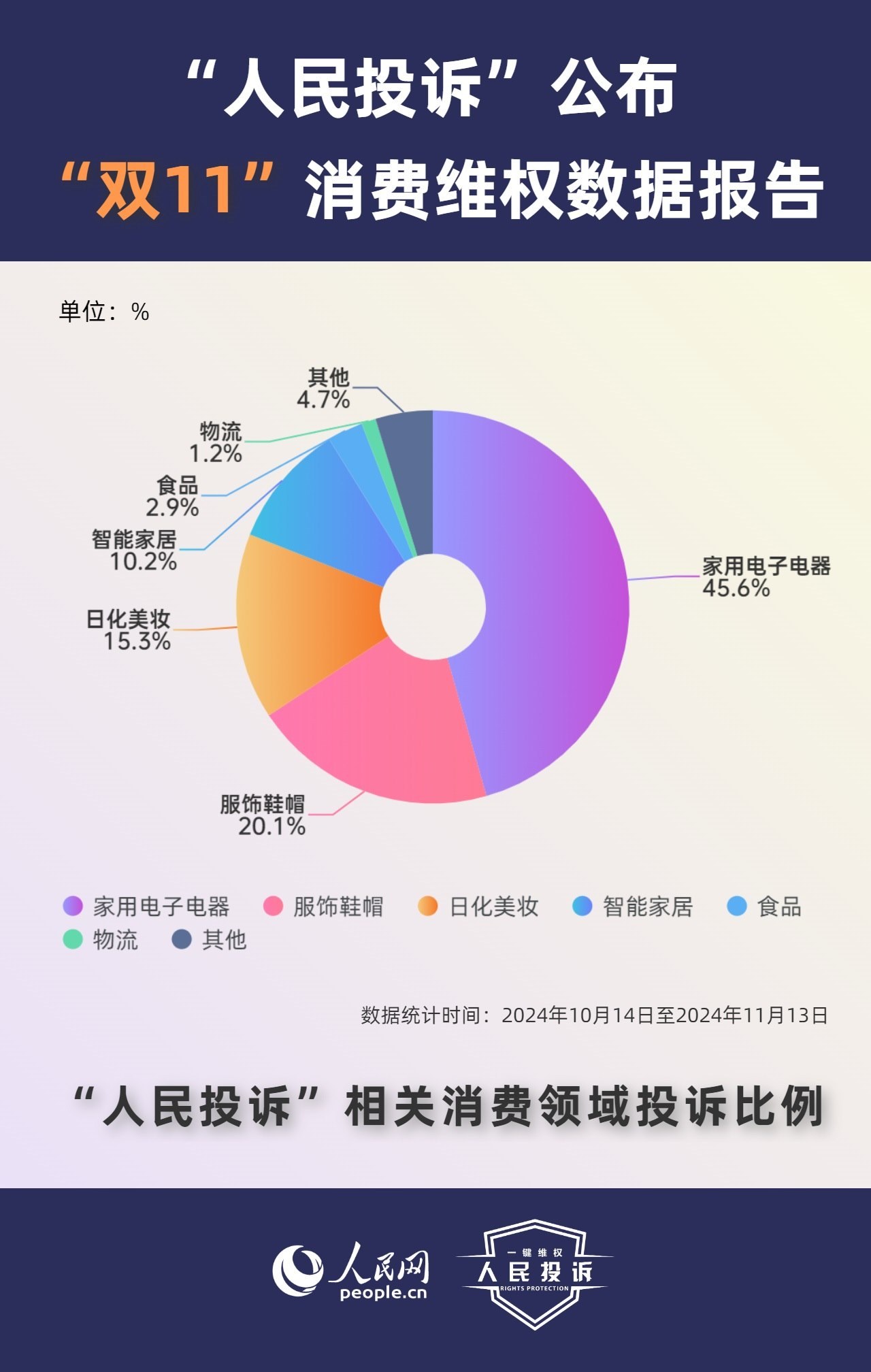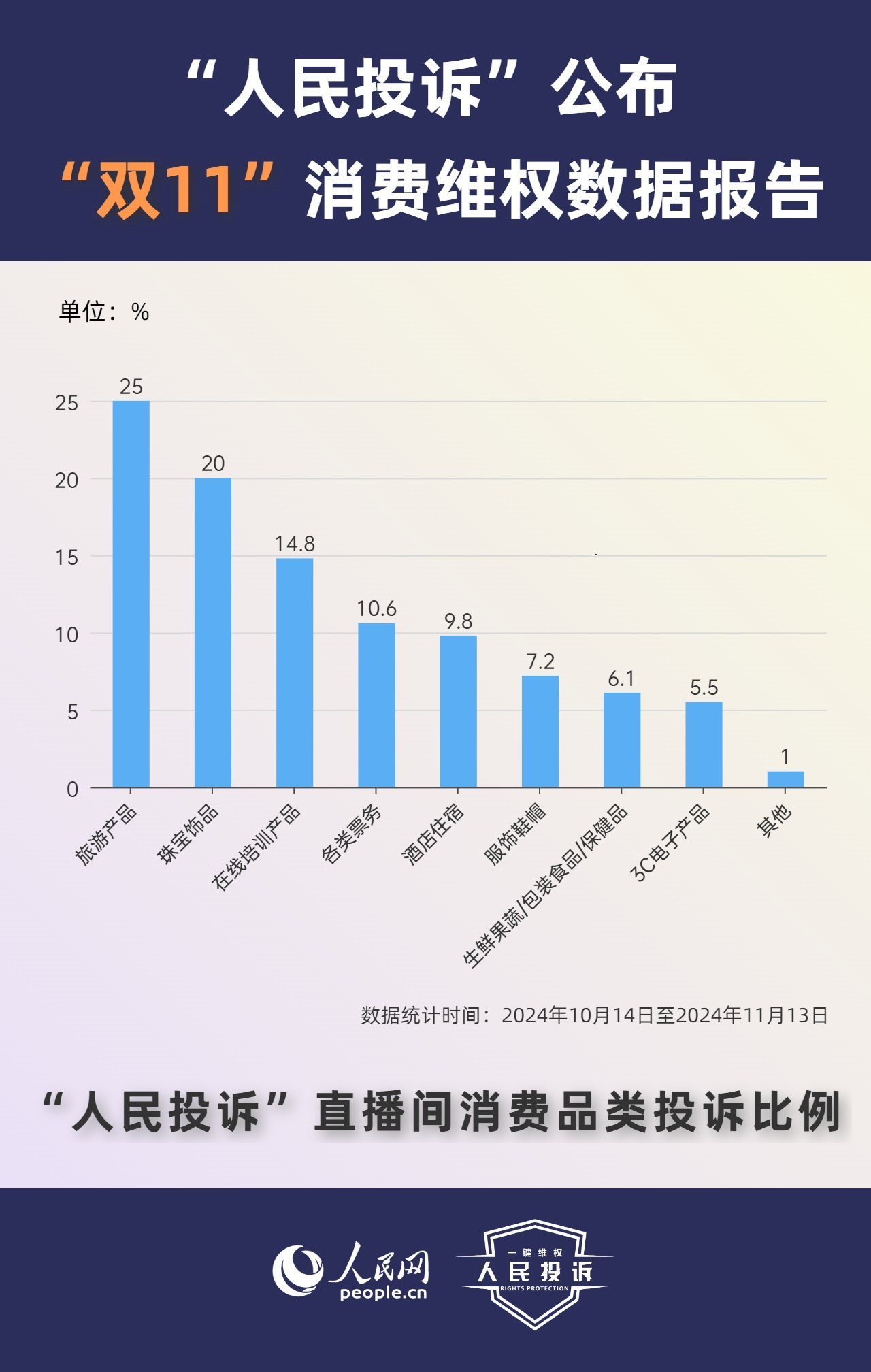 那么,今年你的“雙11”購(gòu)物還遇到了哪些“套路”?據(jù)人民網(wǎng)“人民投訴”平臺(tái)統(tǒng)計(jì),“雙11”期間平臺(tái)共收到17699條(數(shù)據(jù)統(tǒng)計(jì)從2024年10月14日-11月13日)投訴信息。其中,手機(jī)、家電、智能產(chǎn)品、美妝服飾等消費(fèi)領(lǐng)域維權(quán)量大;平臺(tái)“國(guó)補(bǔ)”“以舊換新”等優(yōu)惠規(guī)則不透明,保價(jià)服務(wù)藏“貓膩”,直播間虛假“破價(jià)”,“百億補(bǔ)貼”商品貨不對(duì)板,“高價(jià)預(yù)售”欺詐等問題反映突出。