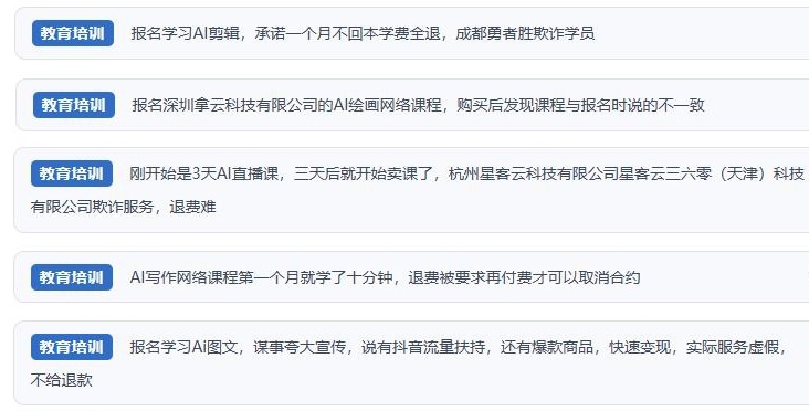 然而,“人民投訴”經(jīng)梳理發(fā)現(xiàn),網(wǎng)絡(luò)上不少消費(fèi)者吐槽相關(guān)課程質(zhì)量良莠不齊,與廣告承諾“免費(fèi)領(lǐng)取AI應(yīng)用體驗(yàn)課及AI工具”“低投入、高回報(bào)”“副業(yè)賺錢”“快速變現(xiàn)”等內(nèi)容大相徑庭。相關(guān)商家虛假宣傳、誘導(dǎo)消費(fèi)、貨不對(duì)板以及退費(fèi)難等問題被反復(fù)提及。