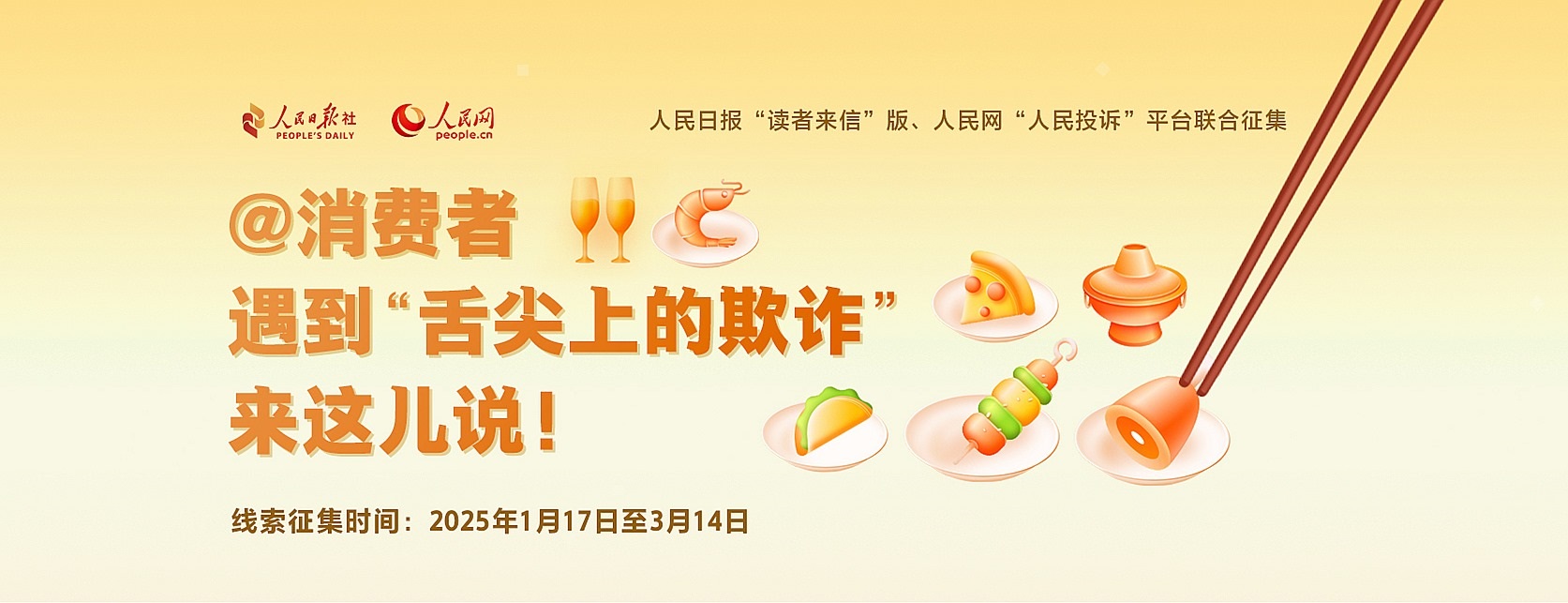 牛肉干里不含牛肉,無糖產品其實含糖,配料表造假、營養(yǎng)成分表不準確……你遇到過嗎?“以假亂真”“以次充好”為代表的食品欺詐,嚴重損害消費者利益,擾亂市場公平競爭秩序。為筑牢食品安全防線,增強消費者信心,即日起,人民日報“讀者來信”版與人民網“人民投訴”平臺聯(lián)合發(fā)起相關線索征集,歡迎您掃描上方海報二維碼進入征集頁面留言或提供調查線索至人民日報“讀者來信”版(郵箱:dzlx@peopledaily.cn 傳真:010-65368495)。線索征集時間截至2025年3月14日。
