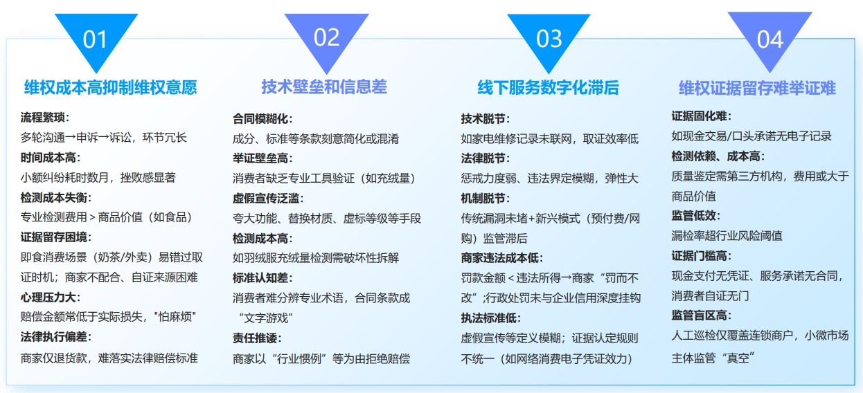 “人民投訴”分析認(rèn)為,在傳統(tǒng)消費領(lǐng)域,消費者往往由于維權(quán)成本高、存在技術(shù)壁壘和信息差、線下服務(wù)標(biāo)準(zhǔn)不一、舉證難等原因使得維權(quán)難、維權(quán)慢、維權(quán)貴等現(xiàn)象始終未能有效減少。