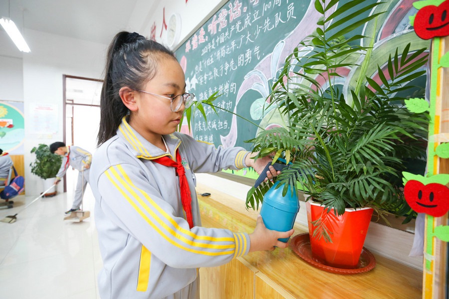 依托班級“人人有事做,事事有人管”的勞動理念,康巴什區(qū)第二小學(xué)每個班都設(shè)置了諸如“護(hù)花小使者”、“節(jié)能小衛(wèi)士”“圖書管理員”等崗位,學(xué)生自愿申請成為崗位負(fù)責(zé)人,陳海葉就是其中之一。