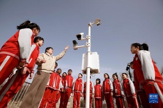 3月23日,學(xué)生在貴州省黔西市氣象局綜合氣象觀測(cè)站聽工作人員講解智能觀測(cè)儀工作原理。