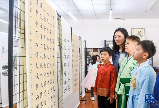 4月10日,在天津小學(xué),學(xué)生在進(jìn)行書畫展示。