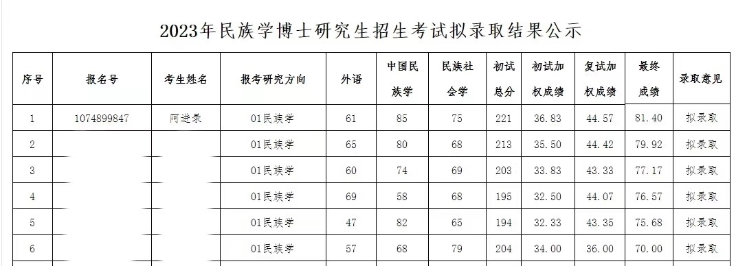 記者了解到,4月9日,青海民族大學研究生院官方網(wǎng)站發(fā)布《青海民族大學2023年民族學博士研究生招生考試擬錄取結果公示》。該公示稱,經(jīng)2023年青海民族大學博士招生工作領導小組審議通過,擬錄取17位考生為民族學博士研究生。根據(jù)公示,考生阿進錄以最終成績81.40分進入擬錄取名單,在民族學(報考研究方向)擬錄取的6名考生中排名第一。(李依環(huán)、實習生遇鏡霖)