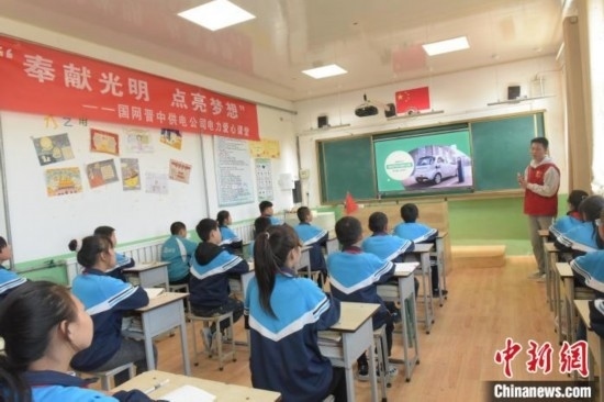 在國家電網(wǎng)“電力愛心教室”內(nèi),電力人員為鄉(xiāng)村兒童科普電力知識(shí)。展望攝