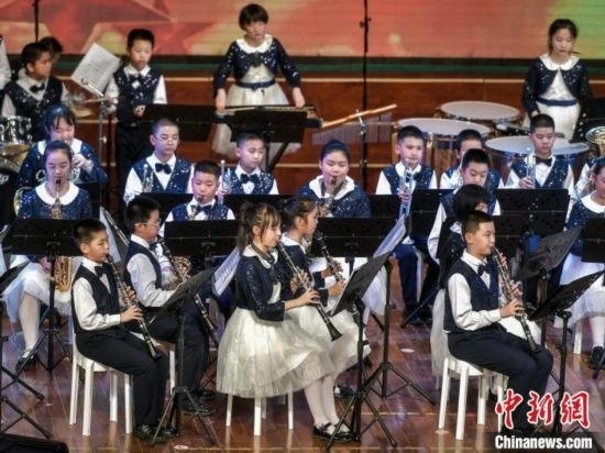 烏魯木齊市第27小學(xué)交響管樂團(tuán)登臺獻(xiàn)藝。中新網(wǎng)記者 劉新 攝
