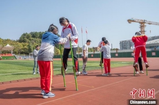 3月19日,兩地學(xué)生一起體驗少數(shù)民族傳統(tǒng)體育項目《高蹺》。唐哲 攝