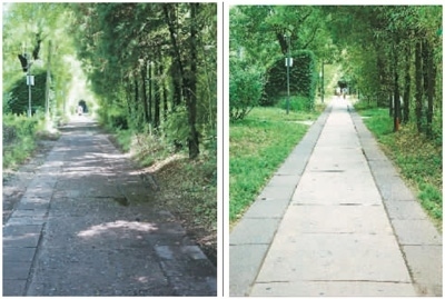 左圖:保護(hù)項(xiàng)目對(duì)燕南園水泥路修復(fù)前的景象。右圖:保護(hù)項(xiàng)目對(duì)燕南園水泥路進(jìn)行修復(fù)后的效果。燕南園保存下來的水泥路以“脫漿彩石混凝土”工藝進(jìn)行施工,老校友稱之為“洋灰路”。這里的“洋灰路”已有76年歷史,大部分仍能正常使用。北大建筑與景觀設(shè)計(jì)學(xué)院的李迪華老師發(fā)現(xiàn),燕南園東側(cè)水泥路破損后,顯露出大小和顏色都參差不齊的石子。于是,他開始追溯這些“洋灰路”的歷史價(jià)值,與北大“燕園公益營建社”的黃可同學(xué)翻閱北大檔案館資料,找到了歷史照片。又幾經(jīng)輾轉(zhuǎn),尋訪到了九旬高齡的老校友。研究發(fā)現(xiàn),燕園中最早的水泥路修建于1948年。為此,李迪華大力呼吁保護(hù)這些水泥路,尋訪到專門修復(fù)歷史路面的施工團(tuán)隊(duì),對(duì)少量保存完整的路面進(jìn)行修復(fù);破損的洋灰原料則被回收,取出原骨料,采用相同的工藝進(jìn)行還原。不僅老材料得到循環(huán)利用,歷史道路的價(jià)值也“凝固”在更新后的路面中。