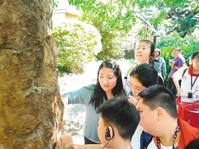 崔碩(左一)給參加研學(xué)活動的孩子講解硅化木的形成。受訪者供圖