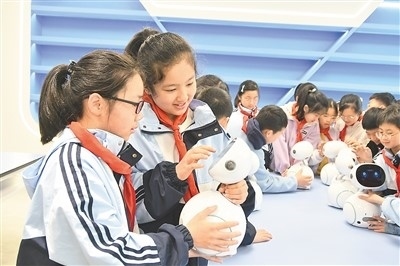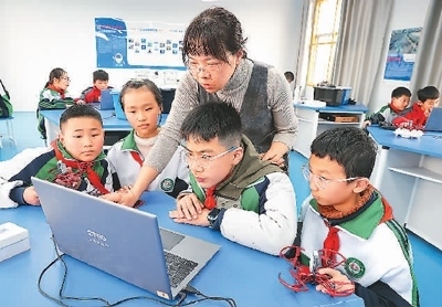江西省上饒市廣豐區(qū)洋口中心小學(xué)人工智能教室里,學(xué)生們在老師的指導(dǎo)下開展人工智能科普課程。朱文標(biāo)攝(人民圖片)