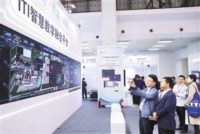 在第33屆(2024年)北京教育裝備展示會上,觀眾參觀智慧教學(xué)融合平臺。張秀科攝(人民圖片)