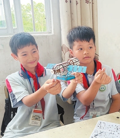 廣西壯族自治區(qū)貴港市平南縣廖村小學的學生在展示科普活動作品。廣西科技館供圖