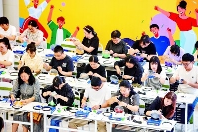 ——將顏料滴入水中,輕輕攪開,把扇子垂直浸入,入水時輕微旋轉(zhuǎn)使紋路多變,之后將扇子垂直拎出、晾干……非遺漆扇課堂上,傳統(tǒng)手藝吸引了眾多學(xué)員參與。