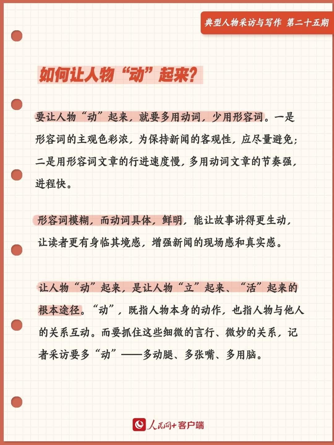要讓人物“動”起來,就要多用動詞,少用形容詞。為什么?一是形容詞的主觀色彩濃,為了保持新聞的客觀性,應盡量避免;二是用形容詞文章的行進速度慢,多用動詞文章的節(jié)奏強,進程快。形容詞模糊,而動詞具體,鮮明,能讓故事講得更生動,讓讀者更有身臨其境感,增強新聞的現場感和真實感。