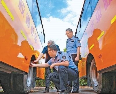 新學期開學在即,為保障學生乘車安全,各地組織開展校車安全專項檢查,對校車安全性能、司機駕駛資格以及隨車配備的安全應急器材等進行檢查,及時排除隱患。圖為8月27日,山東省聊城市茌平區(qū)交警在檢查溫陳街道的校車。