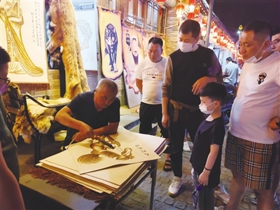 在老街上一些具有民族特色的皮畫店、皮包店也成為了人們駐足消費、觀賞的熱點商鋪。在一家皮畫店,皮畫師在現(xiàn)場制作皮畫,看著精美的圖案被皮畫師一筆一筆地勾勒出來,不少市民都忍不住停下腳步?!皫Ш⒆映鰜黹e逛,看到皮畫孩子主動提出來要看,皮畫是咱們呼市特有的,現(xiàn)場制作,能讓更多人了解制作過程,了解皮畫,挺好的?!笔忻裰芟壬f。