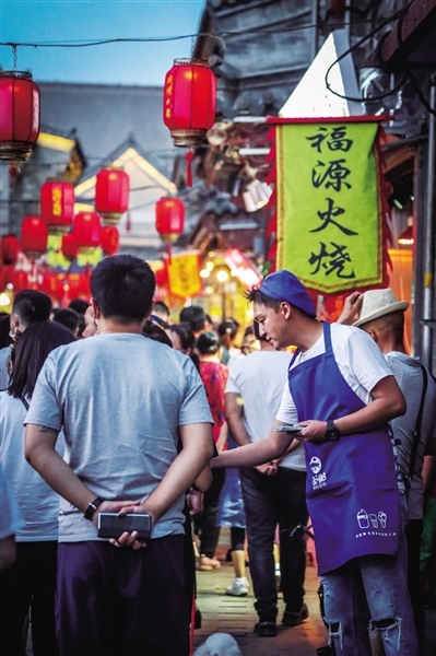 6月7日正值周日,夜幕還未降臨,大召廣場上已經聚集了不少消遣的市民,他們當中有六七十歲的老人,也有二三十歲的青年,還有牽著父母手的孩童。隨著時間的推移,廣場上的人越來越多,而緊挨著廣場的通順大巷更是人頭攢動,吆喝聲、叫賣聲、談笑聲、音樂聲混在一起,形成了夏季獨有的市井之聲。街上,從本地的稀果羹、羊肉串、烤面筋到北京爆肚、武漢臭豆腐可謂應有盡有,家家戶戶的門前都或多或少的有市民排隊等候。