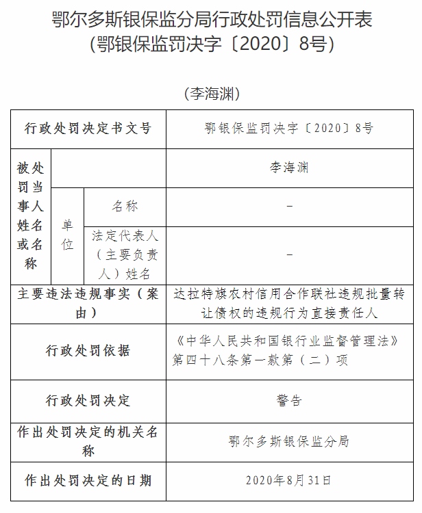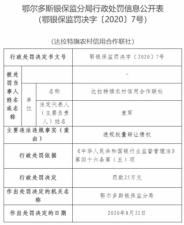 早在2019年11月26日,達(dá)拉特旗農(nóng)村信用合作聯(lián)社就曾因存在貸款“三查”制度落實(shí)不到位,貸款資金被挪用,被鄂爾多斯銀保監(jiān)分局罰款25萬(wàn)元。據(jù)了解,達(dá)拉特旗農(nóng)村信用合作聯(lián)社因存在貸款“三查”制度落實(shí)不到位,貸款資金被挪用的違規(guī)事實(shí),趙新明及楊東負(fù)直接責(zé)任。鄂爾多斯銀保監(jiān)分局根據(jù)相關(guān)規(guī)定,對(duì)達(dá)拉特旗農(nóng)村信用合作聯(lián)社罰款25萬(wàn)元,對(duì)趙新明給予警告處分,楊東被罰終身禁業(yè)。