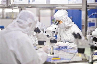 工人在包頭江馨微電機(jī)科技有限公司數(shù)字化百級(jí)無(wú)塵車間趕制配套5G手機(jī)產(chǎn)品的音圈馬達(dá)。