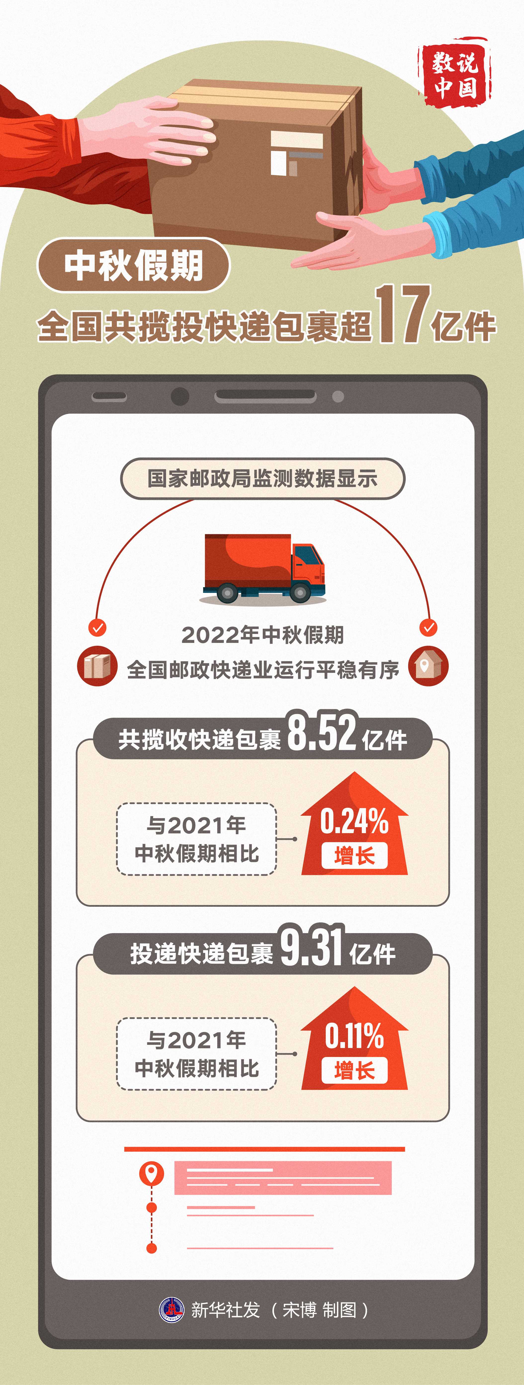 國家郵政局監(jiān)測數(shù)據(jù)顯示,2022年中秋假期全國郵政快遞業(yè)運行平穩(wěn)有序,共攬收快遞包裹8.52億件,與2021年中秋假期相比增長0.24%;投遞快遞包裹9.31億件,與2021年中秋假期相比增長0.11%。