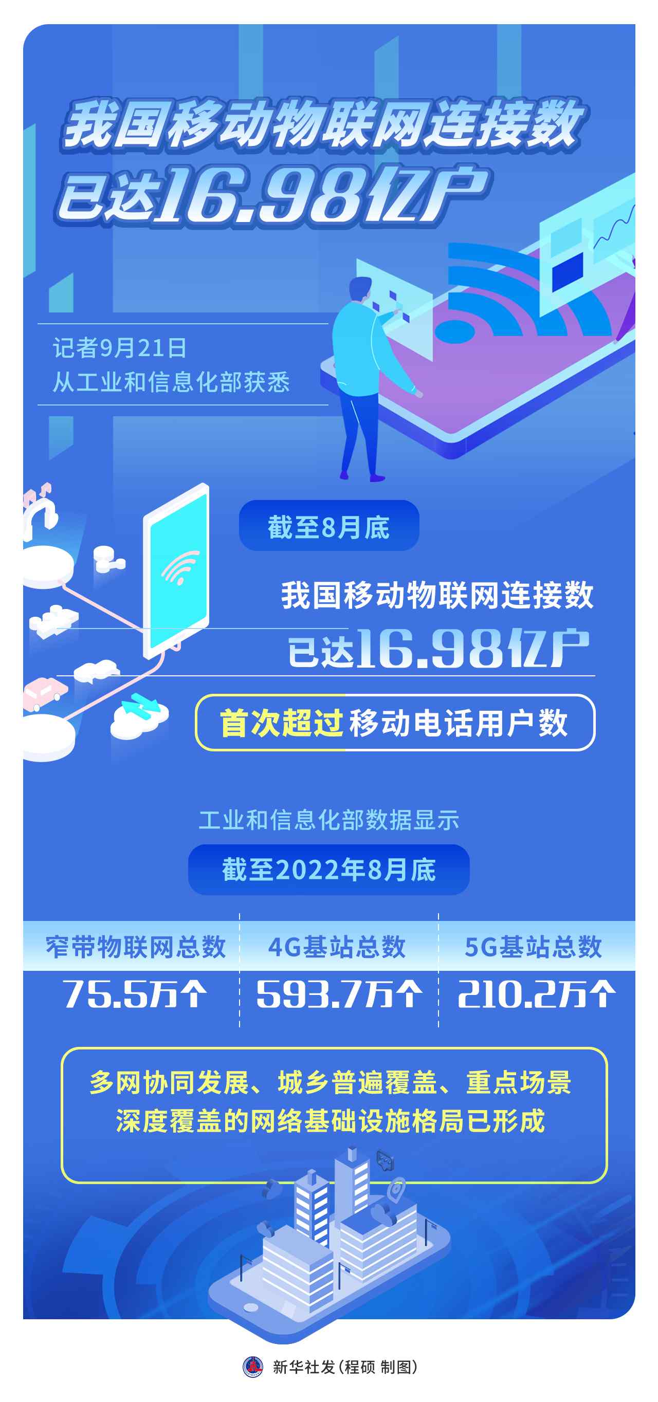 記者21日從工業(yè)和信息化部獲悉,截至8月底,我國移動物聯(lián)網(wǎng)連接數(shù)已達16.98億戶,首次超過移動電話用戶數(shù)。