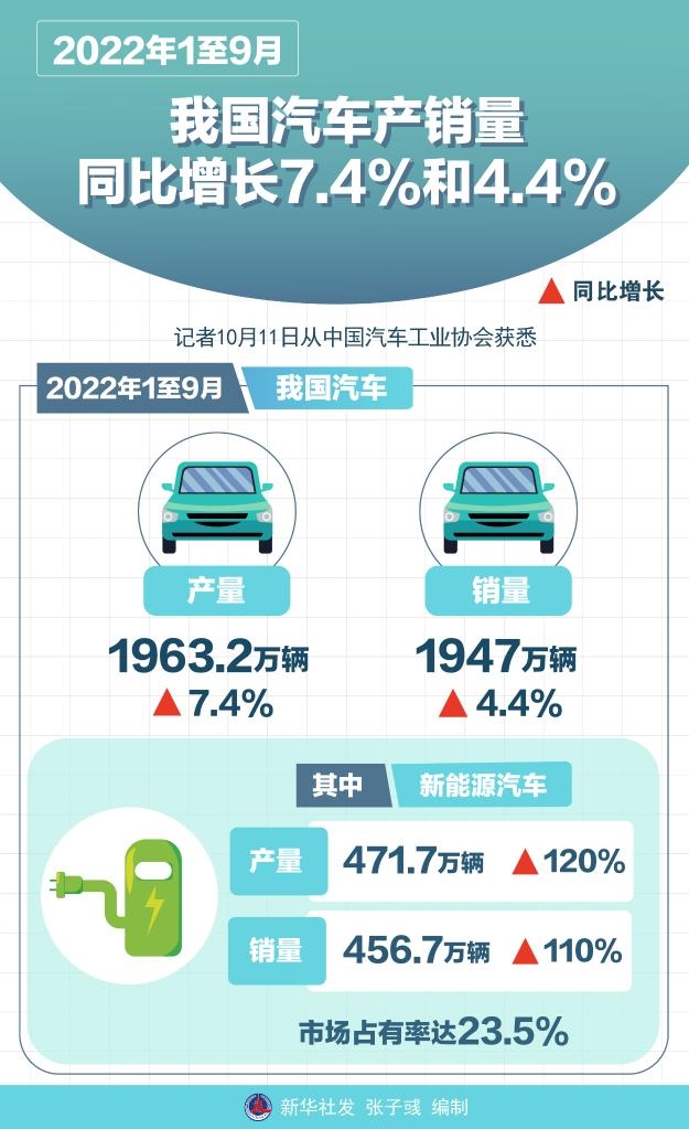 記者11日從中國(guó)汽車(chē)工業(yè)協(xié)會(huì)獲悉,今年1至9月,我國(guó)汽車(chē)產(chǎn)銷(xiāo)量分別達(dá)1963.2萬(wàn)輛和1947萬(wàn)輛,同比增長(zhǎng)7.4%和4.4%。其中,新能源汽車(chē)產(chǎn)銷(xiāo)量分別達(dá)471.7萬(wàn)輛和456.7萬(wàn)輛,同比增長(zhǎng)120%和110%,市場(chǎng)占有率達(dá)23.5%。