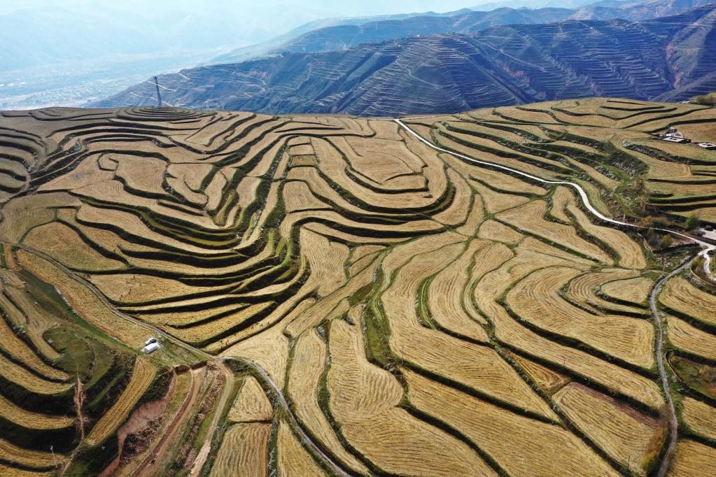 這是10月19日拍攝的青海省黃南藏族自治州同仁市黃乃亥鄉(xiāng)日秀瑪村的燕麥田(無(wú)人機(jī)照片)。新華社記者 陳杰 攝