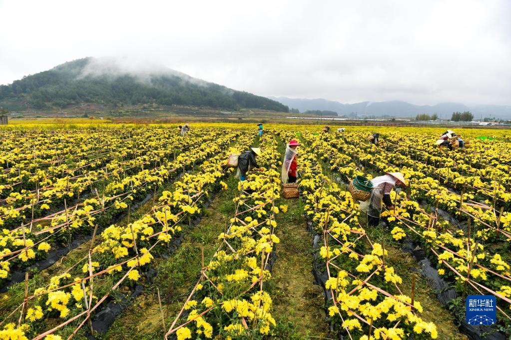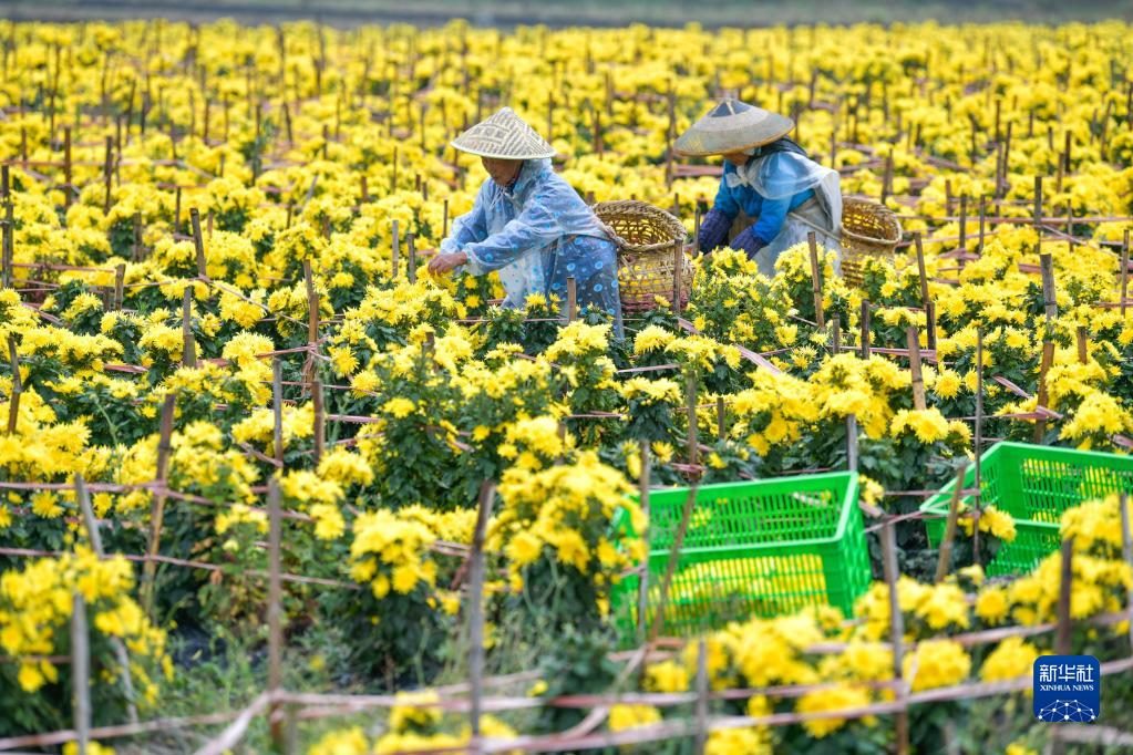 金秋時(shí)節(jié),貴州省黔南布依族苗族自治州貴定縣云霧鎮(zhèn)種植的1000余畝菊花陸續(xù)進(jìn)入采摘期,當(dāng)?shù)卮迕衩χ烧⒎謷?、烘干菊花,供?yīng)市場。