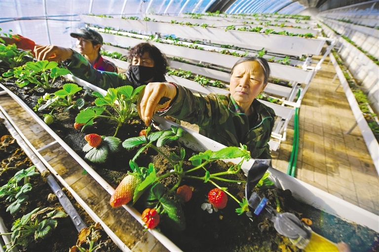 春節(jié)期間,蘇尼特右旗賽漢塔拉鎮(zhèn)扶貧產(chǎn)業(yè)園區(qū)的日光大棚里,菜農(nóng)們正在采摘立體種植的草莓。當?shù)攸h委政府引導居民整合土地建設(shè)日光溫室大棚,以“土地入股企業(yè)分紅”“承包大棚按企業(yè)要求種植”“務(wù)工就業(yè)”等方式實現(xiàn)增收致富。(記者 王曉博 攝)
