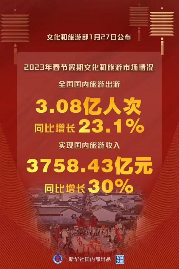 文化和旅游部27日公布2023年春節(jié)假期文化和旅游市場(chǎng)情況。經(jīng)文化和旅游部數(shù)據(jù)中心測(cè)算,今年春節(jié)假期全國(guó)國(guó)內(nèi)旅游出游3.08億人次,同比增長(zhǎng)23.1%。實(shí)現(xiàn)國(guó)內(nèi)旅游收入3758.43億元,同比增長(zhǎng)30%。全國(guó)文化和旅游市場(chǎng)總體安全平穩(wěn)有序。