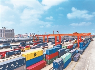 說話的空當(dāng),咚咚咚……十幾輛運(yùn)輸車?yán)d著集裝箱,有序開進(jìn)場站。汽車的轟鳴聲,吊車的運(yùn)行聲,作業(yè)人員大聲溝通的聲音,一首陸港“交響曲”奏響著。