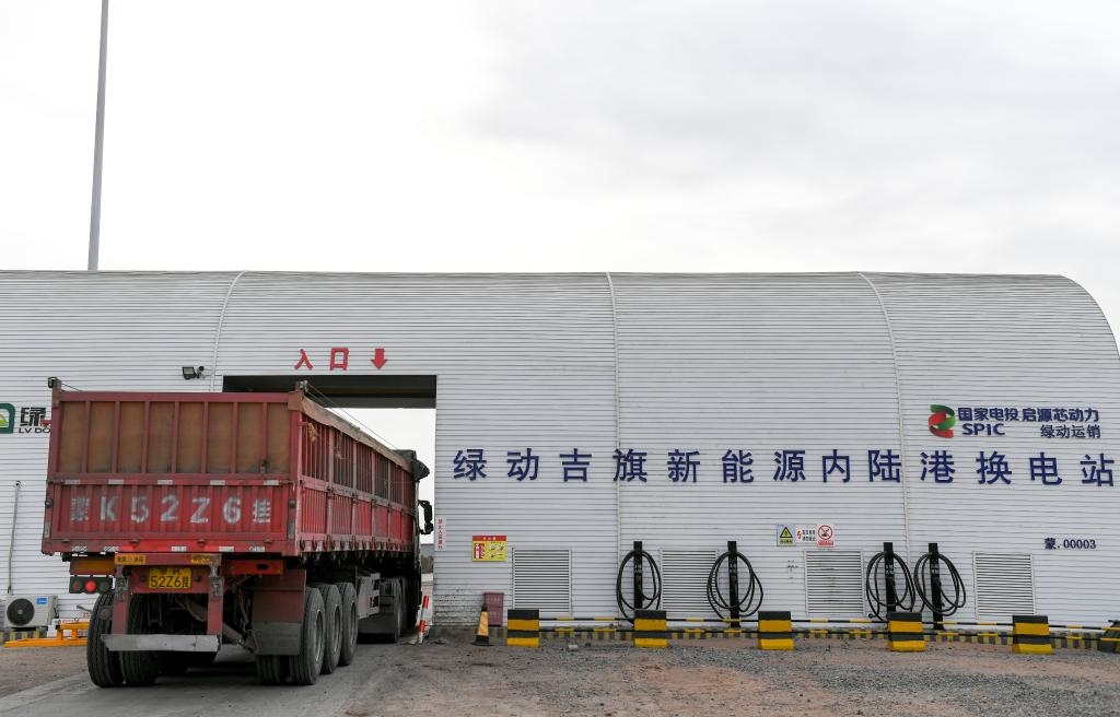 在鄂爾多斯市東勝區(qū)綠動萬利新能源智慧陸港,新能源重卡進(jìn)行全自動換電。新華社記者貝赫 攝