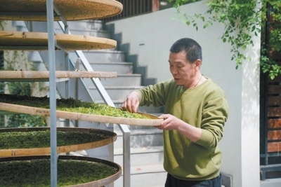 畢建林在曬茶。馮 靜攝