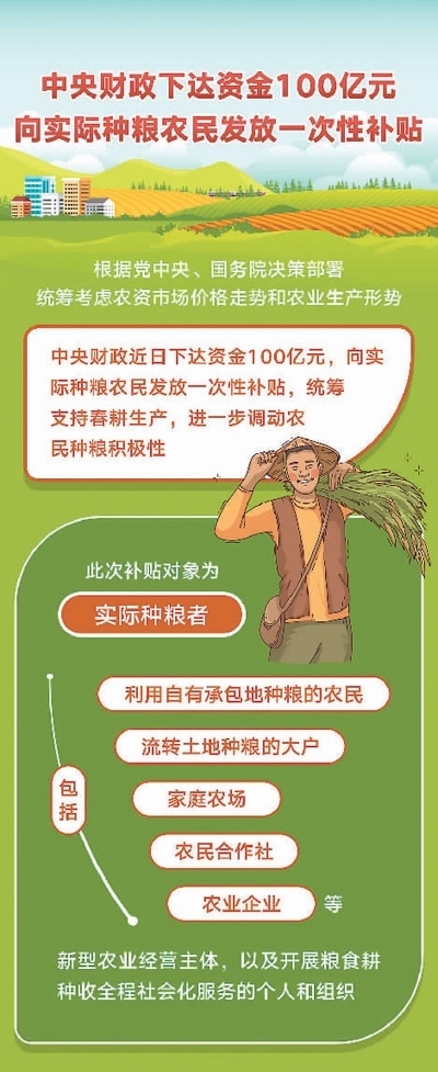 為此,國家統(tǒng)籌考慮農(nóng)資市場(chǎng)價(jià)格走勢(shì)和農(nóng)業(yè)生產(chǎn)形勢(shì),中央財(cái)政向?qū)嶋H種糧農(nóng)民發(fā)放一次性補(bǔ)貼100億元,以穩(wěn)定農(nóng)民收入、保護(hù)農(nóng)民種糧積極性。