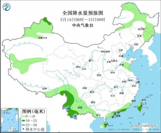 全國降水量預(yù)報(bào)圖(5月13日08時(shí)-14日08時(shí))