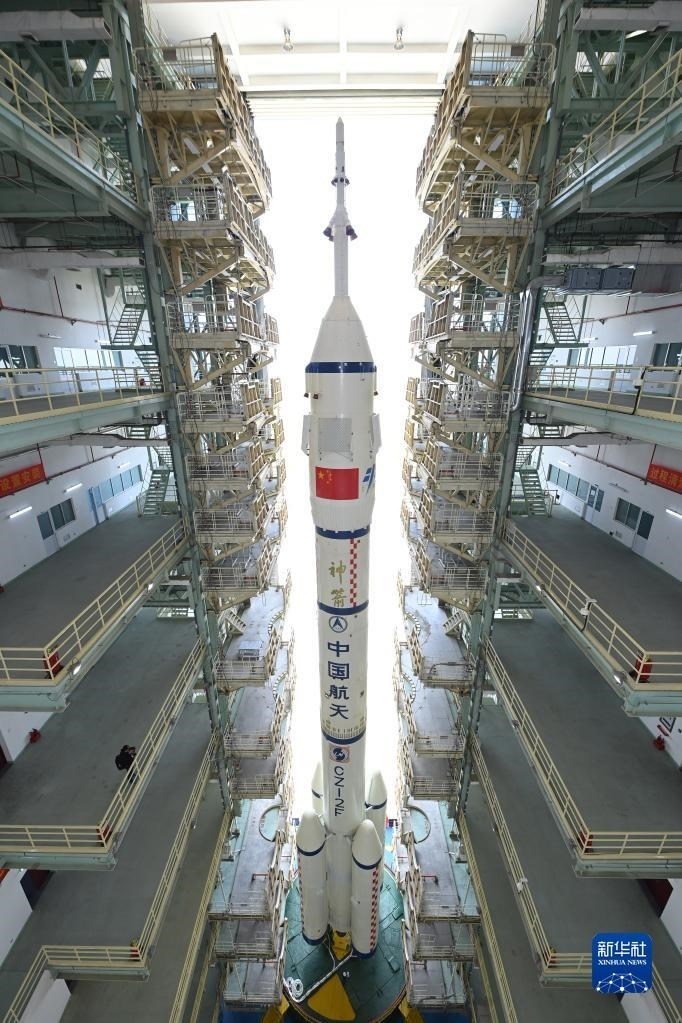5月22日,神舟十六號載人飛船與長征二號F遙十六運載火箭組合體轉(zhuǎn)運至發(fā)射塔架。新華社發(fā)(汪江波 攝)