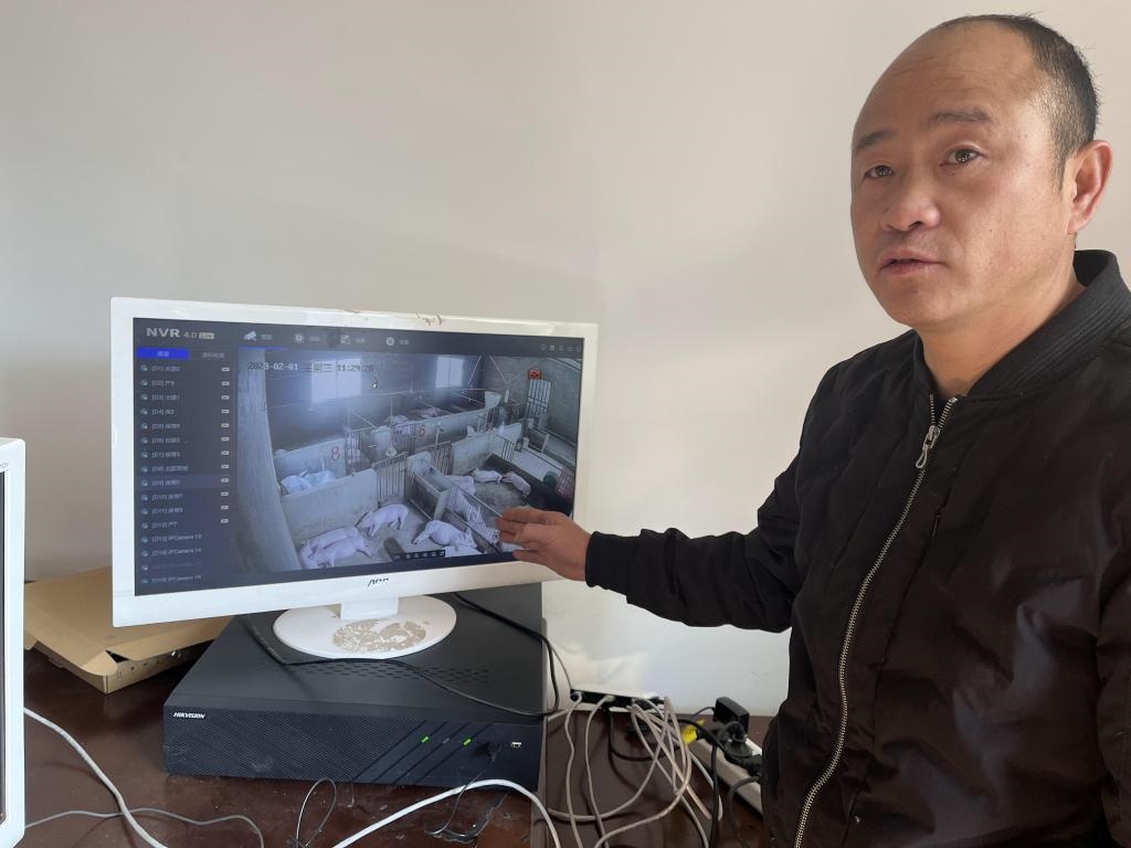 圖為2023年2月1日拍攝的何西康通過線上視頻監(jiān)控平臺(tái)查看豬崽生長(zhǎng)情況。新華社記者 李驚亞 攝