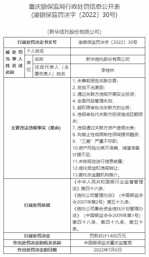 2022年下半年,重慶銀保監(jiān)局曾對(duì)新華信托開(kāi)出二十余張“罰單”。