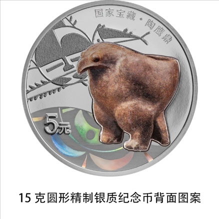 15克圓形銀質(zhì)紀(jì)念幣背面圖案為陶鷹鼎造型,襯以仰韶文化相關(guān)紋飾,并刊“國(guó)家寶藏·陶鷹鼎”字樣及面額。