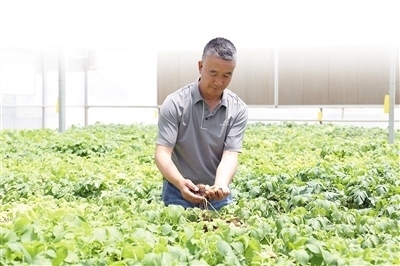 定西馬鈴薯研究所負(fù)責(zé)人李進(jìn)福在查看馬鈴薯原原種長勢。本報(bào)記者 王錦濤攝