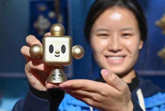 11月29日,在鏈博會文創(chuàng)小店服務(wù)的志愿者向記者展示 “鏈氪”玩具手辦。