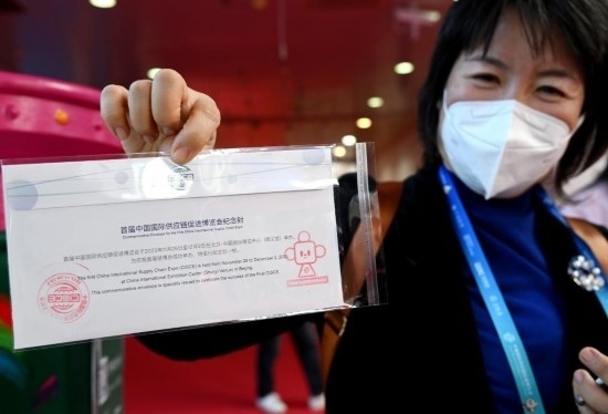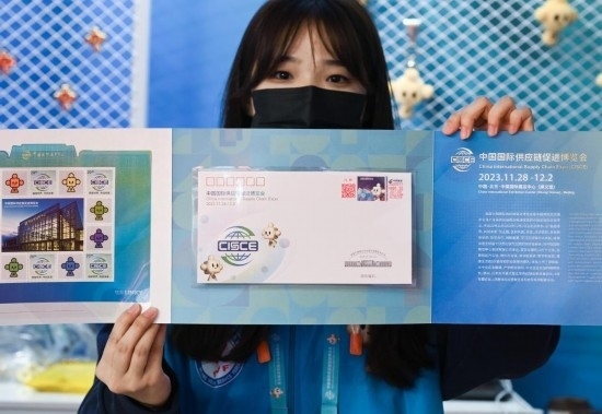 11月29日,一名觀展者在自己購買的鏈博會紀(jì)念郵封上加蓋了帶有“鏈氪”形象的紀(jì)念郵戳。