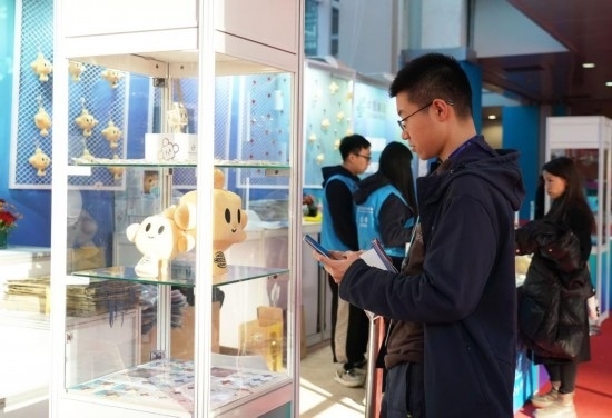 11月29日,一名在鏈博會文創(chuàng)小店服務(wù)的志愿者向記者展示帶有“鏈氪”形象的鏈博會專屬紀(jì)念郵折。