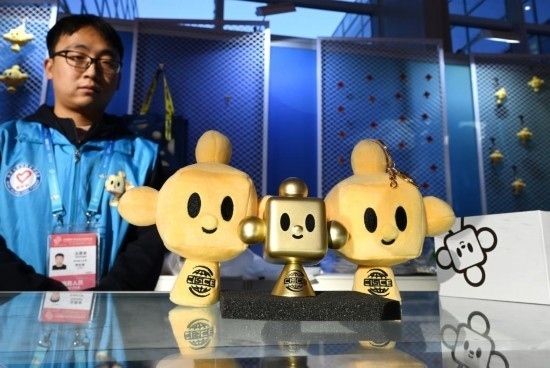 11月29日,在鏈博會文創(chuàng)小店的柜臺上放置著“鏈氪”形象的文創(chuàng)用品供觀展者選購。