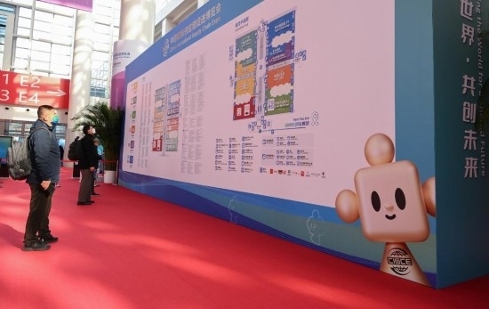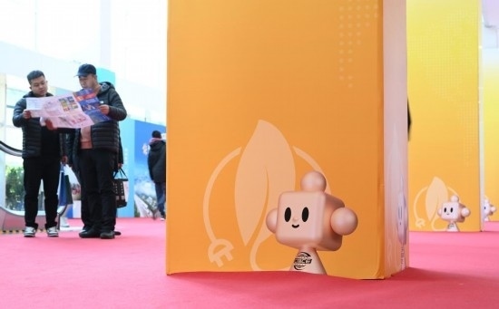 11月29日,鏈博會會場入口處的地圖導(dǎo)引墻上印有吉祥物“鏈氪”的形象。