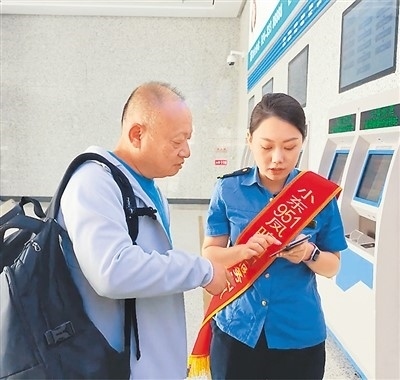 遼寧朝陽(yáng)“小東951·鳳鳴朝陽(yáng)”服務(wù)團(tuán)隊(duì)成員幫助旅客使用手機(jī)12306APP購(gòu)票。沈陽(yáng)局供圖