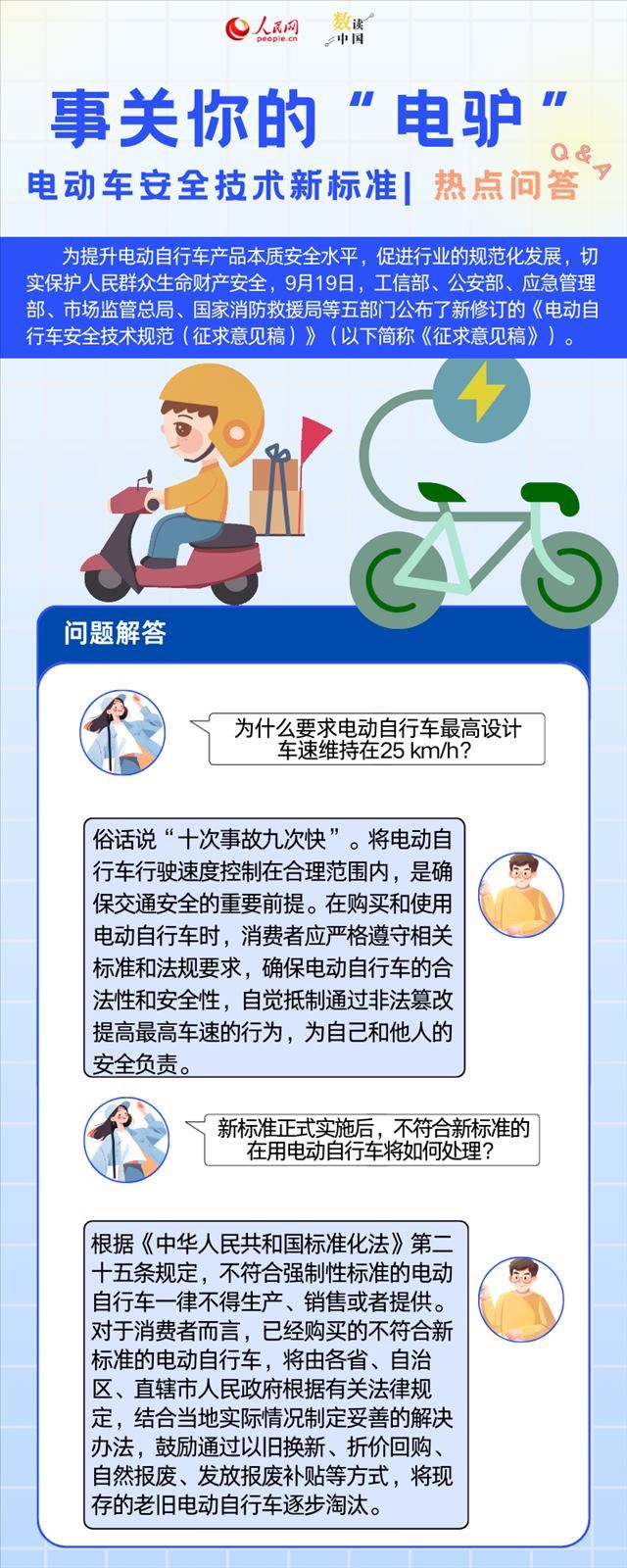人民網(wǎng)北京9月19日電 (申佳平、方經(jīng)綸)為提升電動(dòng)自行車(chē)產(chǎn)品本質(zhì)安全水平,促進(jìn)行業(yè)的規(guī)范化發(fā)展,切實(shí)保護(hù)人民群眾生命財(cái)產(chǎn)安全,9月19日,工信部、公安部、應(yīng)急管理部、市場(chǎng)監(jiān)管總局、國(guó)家消防救援局等五部門(mén)公布了新修訂的《電動(dòng)自行車(chē)安全技術(shù)規(guī)范(征求意見(jiàn)稿)》(以下簡(jiǎn)稱(chēng)《征求意見(jiàn)稿》)。